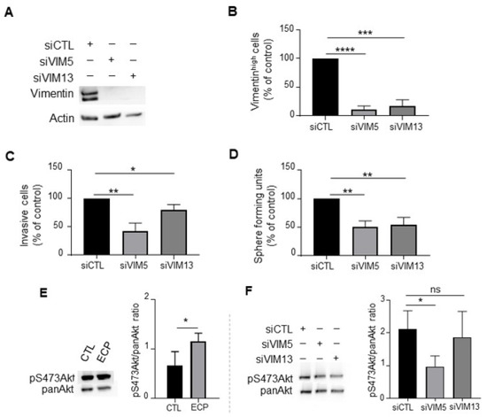 Effects of vimentin silencing on invasion, sphere formation and Akt phosphorylation in MDA-MB-231 persistent cells. Four days after ECP treatment, MDA-MB-231 persistent cells were seeded and cultured for 24 h before transfection with 2 sequences of siRNA targeting vimentin (VIM5, VIM13). Three days after transfection, vimentin levels were determined by Western blotting (A), or flow cytometry analysis to quantify vimentinhigh sub-population (B). Cells with fluorescence intensity ≥ log 103 were considered as vimentinhigh. (C) Effect of vimentin silencing on invasion of persistent cells. Three days after transfection with siRNA against vimentin, MDA-MB-231 persistent cells were seeded in the top of Boyden microchambers precoated with Matrigel. Invasive cells were counted following 24 h of culture. (D) Effect of vimentin silencing on sphere formation of persistent cells. Three days after transfection with siRNA against vimentin, MDA-MB-231 persistent cells were cultured in suspension in defined medium as described in materials and methods. The number of spheres was counted under a contrast phase microscope after 7 days of culture. (E) Western blot analysis of pS473Akt in control and persistent cells. Actin was used as loading control. (F) Western blot analysis of pan-Akt and pS473Akt in vimentin silenced persistent cells. Pan-Akt was used as loading control. Quantitative graphics correspond to 3 independent experiments and illustrations are representative of 3 independent experiments. ns, not significant; *, p < 0.05; **, p < 0.01; ***, p < 0.001; ****, p < 0.00001. Unpaired Student t-test.