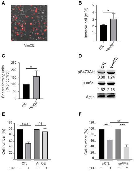 Effect of vimentin overexpression on invasion, sphere formation, Akt activation and drugs sensitivity in MDA-MB-231 wild type cells. MDA-MB-231 wild type cells were seeded and cultured 24 h before transfection with plasmid overexpressing vimentin (VimOE) or control (CTL). The day after transfection, vimentin expression was evaluated by fluorescent microscopy with the texas red filter (A; Nikon, 10x). All experiments were performed 24 h after transfection. (B) Effect of VimOE on invasion. VimOE cells were seeded on the top of Boyden micro-chambers precoated with Matrigel. Invasive cells were counted following 24 h of culture. (C) Effect of VimOE on sphere formation. VimOE cells were cultured in suspension in defined medium described in materials and methods. The number of spheres was counted under a contrast phase microscope after 7 days of culture. (D) Western blot analysis of pan-Akt and pS473Akt in MDA-MB-231 VimOE cells. Actine was used as loading control. (E,F) Vimentin effect in drug sensibility. MDA-MB-231 wild type cells were seeded and cultivate 24 h before transfection with siRNA or plasmid targeted vimentin expression level similar as is previously described. The day after transfection, cells inhibited or overexpressed vimentin were seeded and then treated in first during 48 h with 8 nM epirubicin and 40 nM cyclophosphamide, and then 1 nM paclitaxel for another 48 h in medium containing 1% FCS. After the 96 h of treatment, the cells were count with hemocytometer. (E) MDA-MB-231 wild type cells silencing for vimentin (siVIM5, siVIM13) or with the siRNA control (siCTL). (F) MDA-MB-231 wild type cells overexpressing vimentin (VimOE) or control (CTL). Quantitative graphics correspond to 3 independent experiments. ns, not significant; *, p < 0.05; **, p < 0.01; ***, p < 0.005; ****, p < 0.0001. Unpaired Student t-test.