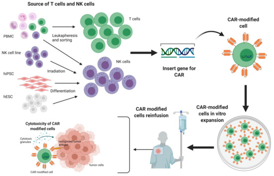 The outline of therapy with CAR-modified T cells and NK cells. Both T cells and NK cells can be obtained from the peripheral blood by leukapheresis; alternatively, NK cells also can be derived from human induced pluripotent stem cells (hiPSC), human embryonic stem cells (hESC), and irradiated NK cell lines. Subsequently, T cells or NK cells are modified with a gene for chimeric antigen receptor (CAR) and expanded in vitro for many days. Finally, CAR-modified cells are re-infused into the patient and exert specific anti-tumor cytotoxicity.