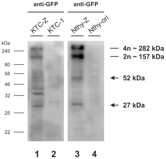 mTaar1-EGFP forms high molecular mass oligomers in stably expressing KTC-Z and Nthy-Z cells. Cell lysates prepared from stably mTaar1-EGFP-expressing KTC-Z and Nthy-Z cells were separated by 12.5% SDS-PAGE along with lysates from non-transduced KTC-1 and Nthy-ori 3-1 cells used as negative controls. Membranes immunolabeled with anti-GFP show two prominent GFP-specific bands at approximately 282 kDa and 157 kDa. An additional band of 27 kDa is observed (arrow), equivalent to the molecular mass of EGFP, and a band at 52 kDa is detected (arrow), which may represent a degradation product of mTaar1-EGFP.
