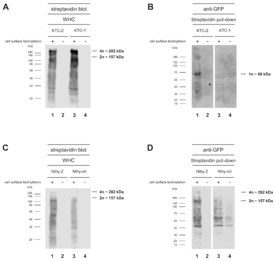 Additionally, cell surface proteins of KTC-Z and Nthy-Z cells, as well as of the non-mTaar1-EGFP-expressing KTC-1 and Nthy-ori 3-1 controls, were subjected to biotinylation under endocytosis-blocking conditions at 4 °C. Proteins in lysates from cell surface biotinylated and non-biotinylated control cells were separated by SDS-PAGE and blots were incubated with HRP-conjugated streptavidin to detect biotinylated proteins. The results show that the proportion of biotinylated proteins corresponding in size to the 282 kDa and 157 kDa mTaar1-EGFP tetramer and dimer, respectively, were prevalent in KTC-Z and Nthy-Z cells (Figure 3A,C). However, the abundance of endogenous biotinylated proteins made any further interpretation difficult.