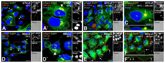 Following incubation at 18 °C, mTaar1-EGFP was predominantly observed in the perinuclear region, i.e., in the ER, as indicated by the green mTaar1-EGFP signal outlining the nuclear envelope and surrounding the nuclei in a reticular pattern, as well as in the Golgi apparatus, as evident from co-localization of the mTaar1-EGFP signal with that of the cis-Golgi marker GM130 (Figure 5A,A’,D,D’). Moreover, mTaar1-EGFP was observed as puncta in the cytoplasm of both KTC-Z and Nthy-Z cells (Figure 5A’,D’, circles), which may represent vesicles at the ER-exit sites of the ER-Golgi intermediate compartment (ERGIC) or secretory vesicles in transit to the cell surface.
