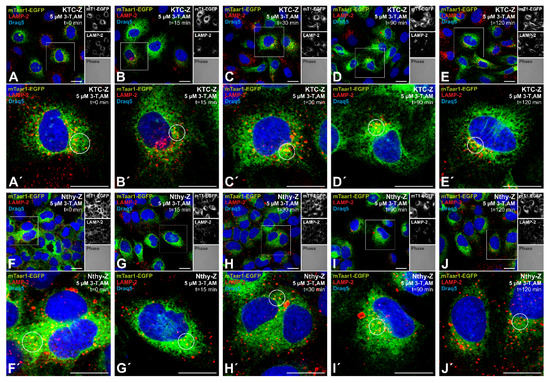 mTaar1-EGFP turnover is constant in steady state and not affected by ligand stimulation. KTC-Z (A–E’) and Nthy-Z cells (F–J’) were fixed and immunolabeled with the lysosomal marker LAMP-2 (red) at 0 min to 120 min after stimulation with 5 µM 3-T1AM, a potential ligand of TAAR1/Taar1 in the thyroid gland. The boxed areas in A–K are magnified in A’–J’, respectively. mTaar1-EGFP (green) partially co-localized with LAMP-2 (red) in endo-lysosomal compartments (yellow) at all time intervals. Circles denote vesicles in which mTaar1-EGFP is seen to co-localize with LAMP-2. Draq5™ was used as nuclear counter-stain. Merged fluorescence (A–J,A’–J’) and corresponding single channel fluorescence and phase contrast micrographs are provided in the right panels of (A–J), respectively, as indicated. Scale bars represent 20 µm.