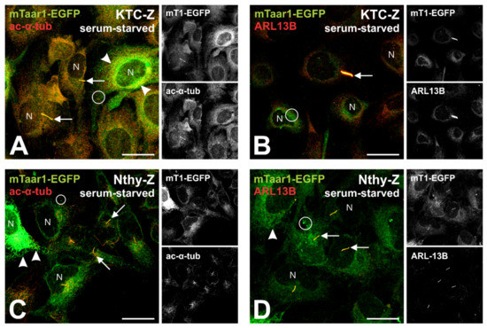 The results described above suggest the notion of mTaar1-EGFP’s transport to primary cilia. However, the structures detected in e.g., KTC-Z cells (see Figure 5C) were not as extended as typically observed in well-differentiated human thyrocytes in situ [2]. In order to recapitulate differentiation states in the G1/G0-phase of the cell cycle, serum-starvation was used to block cell cycle progression at the G1/S transition using a protocol recently established by us for KTC-1 and Nthy-ori 3-1 cells [14]. In addition, the protocol of co-localization of mTaar1-EGFP with marker proteins like acetylated α-tubulin and ARL13B was adapted to sequential fixation of the serum-starved cells with PFA and methanol, respectively, in order to preserve ciliary structures.