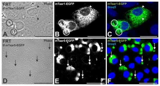 Transient expression of mTaar1-EGFP in Fisher rat thyroid (FRT) cells results in endoplasmic reticulum (ER) retention. (A–C) mTaar1-eGFP has a reticular localization in FRT cells (arrowheads), indicating mTaar1-EGFP (white in B, and green in C) to be primarily confined to the ER when singly expressed in FRT cells. (D–F) FRT cells expressing mTaar5-EGFP revealed the protein (white in E, and green in F) to frequently localize at cilia and the lateral borders between neighboring cells (arrows). Phase contrast (A,D) and corresponding single (B,E) and merged fluorescence micrographs (C,F) for mTaar-EGFP (green) and Draq5™ as nuclear counter-stain (blue) are shown. Circles highlight cell debris. Scale bars represents 20 µm in (A–C) and 50 µm in (D–F).