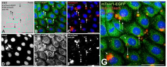 However, transient mTaar1-EGFP expression in cilia-bearing FRT cells results in endoplasmic reticulum (ER) retention, thereby hindering mTaar1-EGFP’s transport to the apical plasma membrane. Hence, we further aimed at delineating possible co-trafficking partners of the same GPCR family in thyrocytes. Taar proteins have been classified into three phylogenetic subgroups [15]. Consequently, Taar5 and Taar8b were picked as representatives of the two other phylogenetic subgroups, besides Taar1. Contrary to Taar1, both Taar5 and Taar8b were previously shown to reach the cell surface in transiently expressing HEK 293T cells [16,17]. Interestingly, co-expression of mTaar1-EGFP and the related hemagglutinin (HA)-tagged mTaar5, HA-mTaar5, promotes Taar1’s ability to reach cilia in transiently co-expressing polarized FRT cells. Therefore, we propose that oligomerization of mTaar1 occurs early in the secretory pathway and promotes Taar1 trafficking to cilia of thyroid epithelial cells.