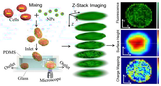 Illustration of the method for a single cell’s surface charge mapping. The cell suspension is mixed with nanoparticles, followed by incubation, washing of unbonded NPs, and capture of cells. The positively charged NPs are attracted onto the wall of the cell due to the electrostatic force. Z-stack images of cells bonded with NPs are captured by a fluorescence microscope, which are processed to map the fluorescence distribution, and thus the surface charge distribution of single cells.