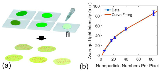 (a) Illustration of calibrating the relation between the nanoparticles’ fluorescence intensity and nanoparticle numbers. (b) The relation between the measured average fluorescent light intensity of nanoparticles and the number of nanoparticles per unit area (1 µm × 1 µm).