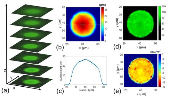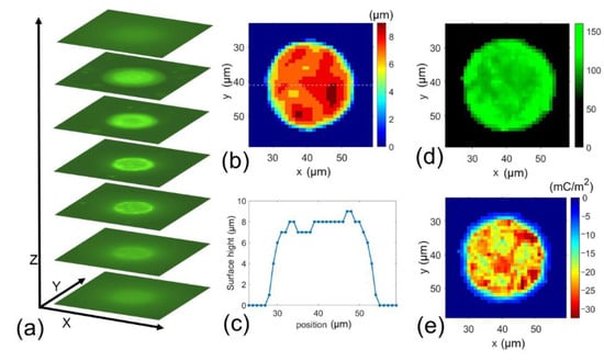 (a–e) Typical measurement results of surface charge mapping of a 31 µm MP. (a) Z-stack images, (b) surface height mapping, (c) the surface height profile at the centerline located in the MP center in X-direction, (d) fluorescent intensity distribution, and (e) the surface charge mapping.