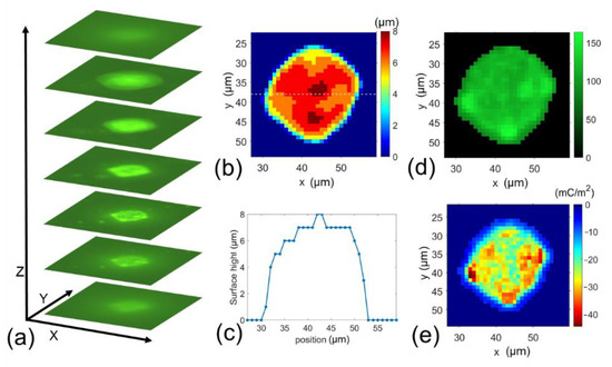 Typical measurement results of surface charge mapping of a Hela cell. (a) Z-stack images, (b) surface height mapping, (c) the surface height profile at the centerline of the cell along X-direction, (d) fluorescent intensity distribution, and (e) cell surface charge mapping.