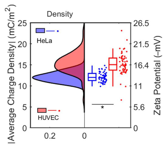 Comparison of the measured average charge density for each cell type, obtained from fluorescence method, and the corresponding zeta potential of HUVEC and Hela cells. Left: distribution of average charge density of cells. Right: boxplot of zeta potential converted from the average charge density of cells. The statistical test showed statistically significant surface charge density difference between Hela cells and HUVEC cells. * p < 0.05 (n = 60).
