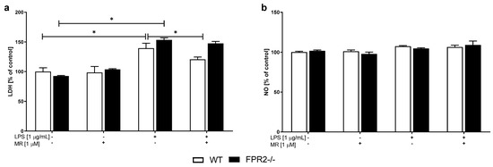 The effects of LPS and the compound MR-39 on cell death (a; LDH) and nitric oxide (b; NO) release in organotypic hippocampal cultures (OHCs) obtained from the offspring of wild-type (WT) and FPR2−/− (KO) mice. OHCs were pretreated with MR-39 and then stimulated with lipopolysaccharide (LPS; 1 μg/mL) for 24 h. Control cultures were treated with the appropriate vehicle. NO release was measured using the Griess reaction. The data are presented as the mean percentages ± SEM of the control (vehicle-treated WT OHCs) from three independent experiments. The results were statistically evaluated using a two-way analysis of variance (ANOVA) with the Duncan post hoc test to assess the differences between the treatment groups. Significant differences are indicated by * p < 0.05. LDH—lactate dehydrogenase; NO—nitric oxide. +—with LPS or MR treatment; -—without LPS or MR treatment.