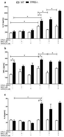 Intriguingly, MR-39 only inhibited the pro-inflammatory response induced by LPS in the WT hippocampal cultures, as evidenced by increased TNF-α and IL-1β production, while it was blocked by WRW4 pretreatment. This observation indicates that the favorable effect of MR-39 was mediated by its interaction with FPR2, probably predominantly on microglial cells, which are the main source of IL-1β and TNF-α. Accordingly, we did not detect an effect of MR-39 on the increased level of IL-6 in KO FPR2 cultures.