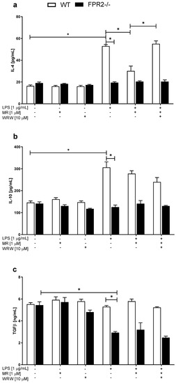 The effects of MR-39 and WRW4 on LPS-evoked anti-inflammatory cytokine (a—IL-4; b—IL-10; c—TGF-β) release in organotypic hippocampal cultures (OHCs) obtained from the offspring of wild-type (WT) and FPR2−/− (KO) mice. OHCs obtained from WT and KO mice were pretreated with the FPR2 antagonist WRW4 (10 µM) for 30 min. Afterward, MR-39 (1 µM) was added and incubated for 1 h, and then OHCs were stimulated with lipopolysaccharide (LPS; 1 μg/mL) for 24 h. Control cultures were treated with the appropriate vehicle. The results are presented as the means ± SEM. The data were derived from three independent experiments. The results were statistically evaluated using a factorial analysis of variance (ANOVA) with Duncan’s post hoc test to assess the differences between the treatment groups. Significant differences are indicated by * p < 0.05. IL—interleukin; TGF-β—transforming growth factor β. +—with LPS, MR or WRW treatment; -—without LPS, MR or WRW treatment.