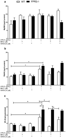 The effects of lipopolysaccharide and/or MR-39 and WRW4 on the (a) MyD88/(b) TRAF6/(c) NFκB-related pathways in organotypic hippocampal cultures (OHCs) derived from the offspring of wild-type (WT) and FPR2−/− (KO) mice. OHCs obtained from WT and KO mice were pretreated with the FPR2 antagonist WRW4 (10 µM) for 30 min. Afterward, MR-39 (1 µM) was added and incubated for 1 h, and then OHCs were stimulated with lipopolysaccharide (LPS; 1 μg/mL) for 24 h. Control cultures were treated with the appropriate vehicle. The results are presented as the means ± SEM. The data were obtained from three independent experiments. The results were statistically evaluated using a factorial analysis of variance (ANOVA) with Duncan’s post hoc test to assess the differences between the treatment groups. Significant differences are indicated by * p < 0.05. TRAF6—TNF receptor-associated factor 6; MyD88—Myeloid differentiation primary response 88; NFκB—Nuclear factor-κB. +—with LPS, MR or WRW treatment; -—without LPS, MR or WRW treatment.