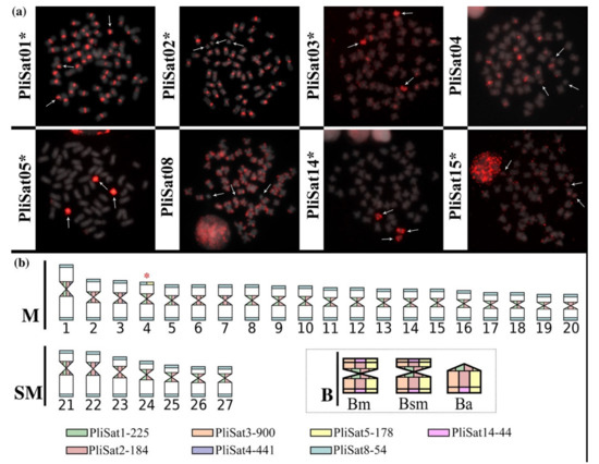 In order to locate multiple probes in the same metaphase plate, especially those mapping simultaneously in A and B chromosomes (e.g., PliSat03, PliSat04, and PliSat05), we performed multiple rounds of FISH with the mentioned probes. In this case, we first performed a regular FISH with a single probe and captured several images. Next, we removed the coverslips and washed the slides with 4× SSC/1% Triton-100 for 5 min. Thereafter, we proceeded with the hybridization protocol again with a reduction of 70% formamide/2× SSC and denaturation time to 30 s. Using this approach, we could successfully map the satDNA sequences for five consecutive rounds.