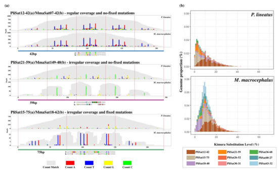 The alignments of eight consensus satDNAs of P. lineatus and M. macrocephalus revealed high sequence conservation and the RepeatProfiler and RepeatMasker analyses added new information in this case. Primarily, we observed no consensus sequences of satDNA families showing 100% identity in the alignments between species (Figure 3). However, the variant profiles provided a genome-wide view of the organization of satDNAs and revealed that six satDNAs (PliSat12, PliSat18, PliSat21, PliSat30, PliSat36, and PliSat40) did not present a fixed mutation (indel or substitution) for a specific species. In this context, even the large gaps observed in the consensus alignments (e.g., PliSat21-59/MmaSat16-51) are not fully fixed (Figure 3a) after millions of years of divergence [47]. Interestingly, the variant profiles of PliSat12-42/MmaSat07-42 revealed that this satDNA was highly abundant in both genomes and also exhibited a notable similarity in the SNPs. Finally, the variant profiles of PliSat15-75/MmaSat18-62 and PliSat43-32/MmaSat26-22 showed a higher degree of differentiation with fixed mutations (Figure 3a).