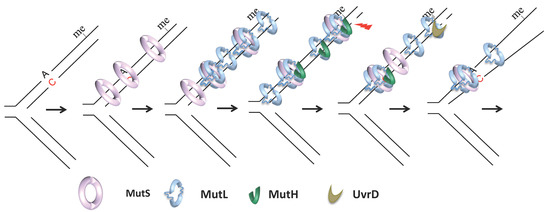 MMR mechanism of E. coli. Replication error repair in E. coli is presumed to be carried out by the following sequence of steps: MutS dimer binds to a mismatch; stabilization of the ATP-bound MutS state; MutS slides away from the mismatch; additional copies of MutS load onto the mismatch -> one or several MutL dimers bind to sliding MutS; MutS or MutL can dissociate from diffusing MutS–MutL complexes -> MutH binds to diffusing MutL or MutS–MutL complexes; physical interaction between MutH and MutL activates MutH endonuclease activity; activated MutH incises the newly synthesized strand at the unmethylated d(GATC) sequence -> MutL and UvrD assemble near the single-strand break -> binding of UvrD to MutL allows unwinding of the portion of the newly synthesized strand beyond the mismatch -> the unwound portion of the new strand is resected; DNA polymerase resynthesizes the excised strand, and DNA ligase seals the nick (not shown); me, methylated GATC sequence (old strand).