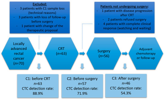 From 2016 to 2020, a total of 166 blood samples were obtained from 63 patients with LARC undergoing treatment. A total of 70 patients were accrued and seven were excluded (three patients with problems in the CTC1 sample, three patients with loss of follow-up before surgery and one patient with modification of the therapeutic proposal). In addition, 7 patients out of the 63 who collected CTC1 (C1) and underwent NCRT did not undergo surgery (one patient with disease progression after NCRT, two patients refused surgery and four patients with a complete clinical response (cCR) being proposed the strategy of WW) (Figure 1).