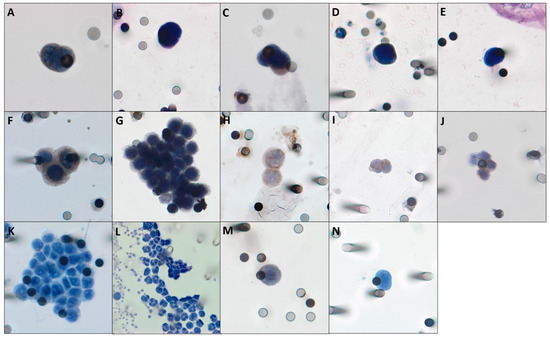 Photomicrographs of CTCs isolated from LARC patients, stained with anti-PD-L1 (A), anti-RAD-23B (B), anti-TGF-βRI (C) and anti-TYMS (D). In (E), a CTC with hematoxylin, without any antibody staining. Following, in boxes (F–H), positive controls (cell lineages, that accordingly to Protein Atlas (https://www.proteinatlas.org/ accessed on 13 December 2016) express the studied antibodies, spiked in healthy individual blood). In (F), FADU lineage, expressing PD-L1. In box (G), HCT-8 cells expressing RAD23B. In (H), A549 cells with TGF-βRI staining; in (I,J), leucocytes staining for TYMS and CD45, respectively. In boxes (K,M,N), negative controls (cell lineages, that accordingly to Protein Atlas (https://www.proteinatlas.org/ accessed on 13 December 2016) do not express or express very low levels of the studied antibodies, spiked in healthy individual blood). In (K), PC3 lineage without any expression of PD-L1. In (M), MCF7 without TGF-βRI staining and in (N), U87MG without TYMS expression. In (L), leucocytes from healthy individuals without RAD23B staining. For negative control of CD45, we used A549 lineage.