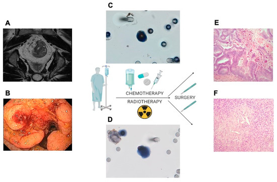 Illustration of a patient with LARC (A,B) evidenced in baseline imaging exams with RAD23B positive in CTC (C) with no response TRG 3 (E) and RAD23B negative on CTC (D) with pCR TRG 0 (F). (A): Rectal lesion on pelvic MRI with extension to perirectal fat with compromised mesorectal lymph nodes; (B): Rectoscopy with evidence of ulcerative injury to the rectum; (C): CTC collected at the time C1 or C2 with positive RAD23B; (D): CTC collected at the time C1 or C2 with negative RAD23B; (E): Anatomopathological examination of the surgical material indicates absence of pathological response with extensive residual neoplasia (TRG 3); (F): Anatomopathological examination of the surgical material with evidence of pCR (TRG 0). Abbreviations: LARC, locally advanced rectal carcinoma; RAD23B, RAD23 homolog B; CTC, circulating tumor cell; TRG, tumor regression grading; MRI, magnetic image resonance; C1, collection 1; C2, collection 2.