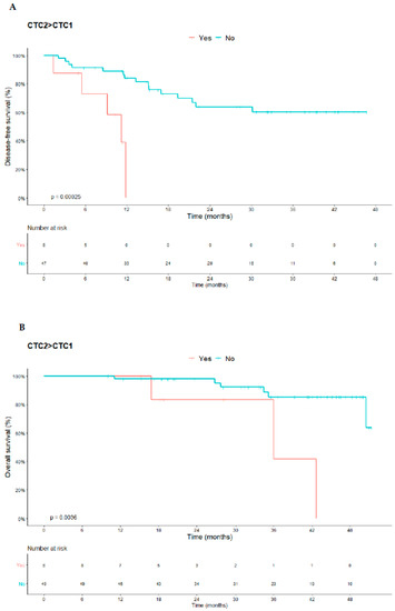 In the univariable analysis for patients with CTC2 > CTC1, we demonstrated worse DFS and OS, respectively (hazard ratio (HR) 7.042; 95% CI, 2.111–23.491; p = 0.001) and (HR 4.954; 95% CI, 1.141–21.504; p = 0.033). Cox’s multivariable regression model suggests that CTC2 > CTC1 remained an independent predictor of DFS and OS, respectively (HR 12.463; 95% CI, 2.998–51.811; p = 0.001) and (HR 5.503; 95% CI, 1.255–24.122; p = 0.024) (Table 3 and Table 4).