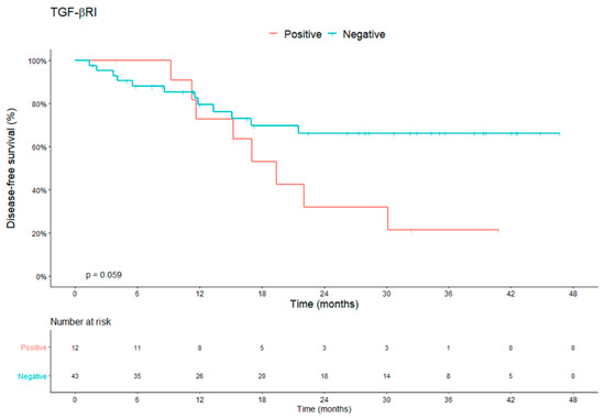 When we evaluated the combined expression of TGF-βRI, we noticed a tendency that its expression in the CTC at any time of the treatment (C1 or C2 or C3) could be correlated with a worse DFS, that is, patients who presented positivity to the expression of TGF-βRI had an average DFS of 22.36 months versus 34.47 months for patients with negative expression (p = 0.059) (Figure 5). For OS, patients with positive expression had an average of 44.34 months versus 47.27 months for patients without expression of TGF-βRI on CTC (p = 0.25).