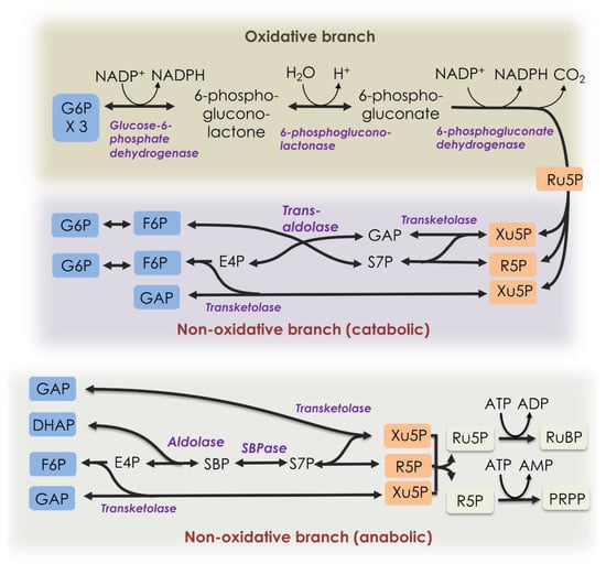 - Stincone, A.; Prigione, A.; Cramer, T.; Wamelink, M.M.C.; Campbell, K.; Cheung, E.; Olin-Sandoval, V.; Grüning, N.-M.; Krüger, A.; Tauqeer Alam, M.; et al. The return of metabolism: Biochemistry and physiology of the pentose phosphate pathway. Biol. Rev. 2015, 90, 927–963. [Google Scholar] [CrossRef]
