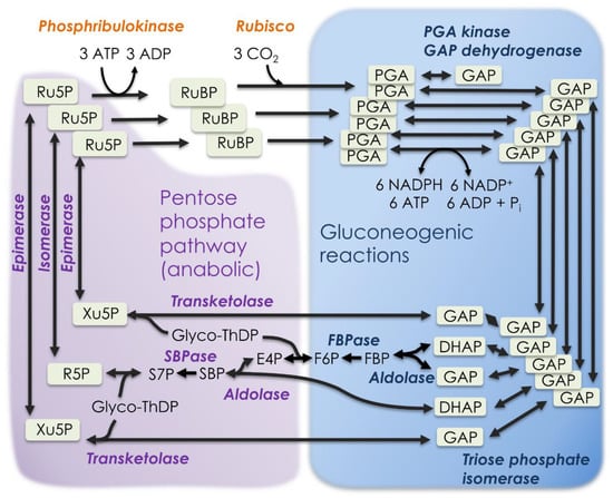 Photosynthetic carbon metabolism, specifically the Calvin–Benson cycle of CO2 uptake and reduction, is considered a variant of the non-oxidative branch of the PPP. It is not uncommon for photosynthetic carbon metabolism to be referred to as the “reductive PPP.” However, the reduction step of the Calvin–Benson cycle is not related to pentose phosphate metabolism but rather to gluconeogenesis (the reversal of glycolysis) [3,4]. The Calvin–Benson cycle has more gluconeogenic enzymes and reactions than PPP reactions (Table 1, Figure 2).