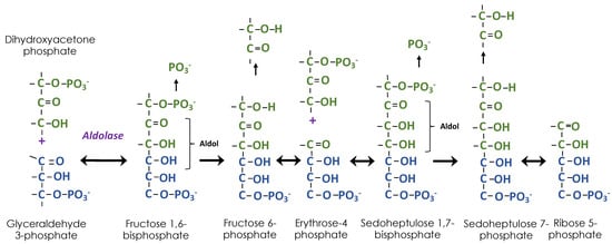 One consequence of this is that the transketolase reaction can be nonspecific. Many ketose sugars can act as a donor and many aldose sugars can act as an acceptor [20]. When the two-carbon fragment is donated to G6P, an octulose 8-phosphate molecule can be formed. This has been reported [21,22,23] (Figure 5). This pathway has sometimes been called the liver version of the non-oxidative pathway [23], but the observations of octulose 8-phosphate, even in photosynthetic organisms [24], would appear to be a consequence of the flexibility of transketolase, and not necessarily indicative of significant flux through octulose 8-phosphate [1] during photosynthesis. The production of G6P from F6P in the stroma during photosynthesis is highly regulated by phosphoglucoisomerase [25]; low concentrations of G6P in the stroma might limit the formation of octulose 8-phosphate.
