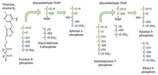 - Racker, E.; Haba, G.D.L.; Leder, I.G. Thiamine pyrophosphate, a coenzyme of transketolase. J. Am. Chem. Soc. 1953, 75, 1010–1011. [Google Scholar] [CrossRef]