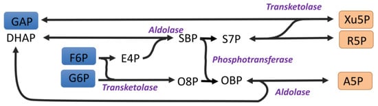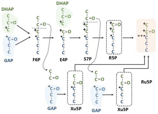 - Horecker, B.L.; Gibbs, M.; Klenow, H.; Smyrniotis, P.Z. The mechanism of pentose phosphate conversion to hexose monophosphate: I. With a liver enzyme preparation. J. Biol. Chem. 1954, 207, 393–404. [Google Scholar] [CrossRef]