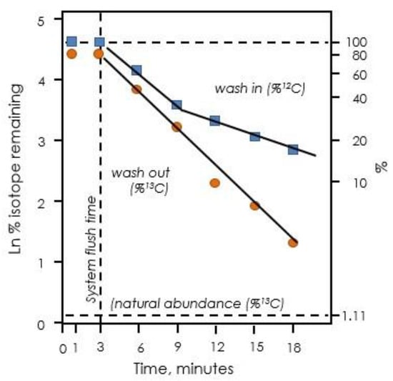 Labeling of Calvin–Benson cycle intermediates provided the insights needed to deduce the path of carbon in photosynthesis. However, in the 1970s, Canvin and colleagues published results of experiments showing that, although the Calvin–Benson cycle intermediates labeled quickly at first, once they were ~80% labeled, the rate of labeling slowed significantly [47,48,49]. This was shown to be also true of isoprene labeling [50], which is now known to reflect labeling kinetics of the Calvin–Benson cycle intermediates [33]. The disappearance of 12C in isoprene when leaves were fed with 99+% 13CO2 showed two distinct phases when plotted on a log scale (Figure 7). Szecowka et al. [45] also pointed out the biphasic labeling pattern they found when 13CO2 was fed to Arabidopsis rosettes and similar data were reported by Hasunuma et al. [51] and Ma et al. [52]. When the CO2 supply was switched back to 12CO2, the disappearance of 13CO2 from emitted isoprene was not biphasic and appeared to have the same time constant as the fast phase of disappearance of 12CO2 in a 13CO2 atmosphere (Figure 7).
