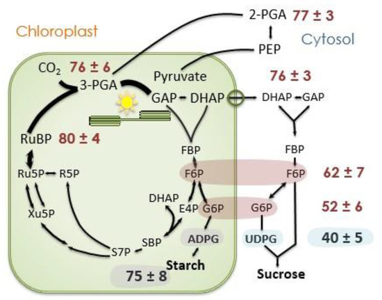 Label in selected photosynthesis intermediates. The proportion of carbon atoms that are 13C 20 min after beginning to feed 13CO2. Data taken from Szecowka et al. [45]. Data for F6P and G6P are for both the stromal and cytosolic pools, presumably the value for ADPG reflects the degree of label in the stromal F6P and G6P pools while UDPG (mostly) reflects the values for cytosolic F6P and G6P. ADPG = ADP-glucose, DHAP = dihydroxyacetone phosphate, E4P = erythrose 4-phosphate, F6P = fructose 6-phosphate, FBP = fructose 1,6-bisphosphate, G6P = glucose 6-phosphate, GAP = glyceraldehyde 3-phosphate, PEP = phosphoenolpyruvate, PGA = 3-phosphoglycerate, R5P = ribose 5-phosphate, Ru5P = ribulose 5-phosphate, RuBP = ribulose 1,5-bisphosphate, S7P = sedoheptulose 7-phosphate, SBP = sedoheptulose 1,7-bisphosphate, and UDPG = UDP-glucose.