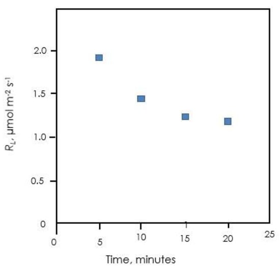 If the cytosolic G6P shunt operates as indicated above, CO2 will be released with the same degree of label as the G6P pool in the cytosol. The rate of that release would be the rate of the cytosolic G6P shunt, estimated above to be on the order of 0.4 µmol m−2 s−1. This is in the range of reported values for RL [64]. The slow-labeling phase when 13CO2 is fed to leaves likely reflects labeling of the cytosolic hexose phosphate pool. As this pool labels, the CO2 released by the G6P shunt will become labeled and the apparent RL measured by the isotopic method should decline. This is in fact observed in unpublished data of Alyssa Preiser (Figure 9).