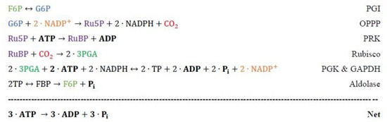 The energy-requiring or -releasing reactions when the oxidative pentose phosphate pathway bypasses the anabolic pentose phosphate pathway of the Calvin-Benson cycle. F6P = fructose 6-phosphate, G6P = glucose 6-phosphate, 3PGA = 3-phosphoglycewrate, R5P = ribose 5-phosphate, Ru5P = ribulose 5-phosphate, RuBP = ribulose 1,5-bisphosphate, and TP = triose phosphate.