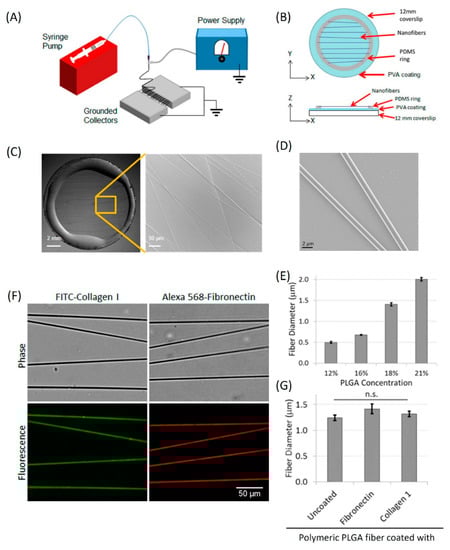 Next, ECM (collagen I or fibronectin) coating conditions were optimized to obtain a uniform ECM coating on PLGA polymeric fibers (Figure 2F). To check the effect of ECM coating on fiber thickness, we performed atomic force microscopy (AFM) on uncoated and ECM coated PLGA polymeric fibers and found no significant difference in fiber diameter with or without the ECM coating (Figure 2G).