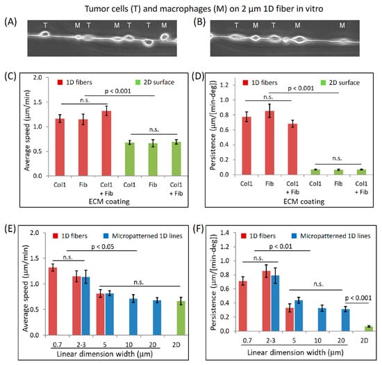 To evaluate the in vivo relevance of our 1D fiber assay, we plated mammary carcinoma cells (MTLn3) on ECM coated PLGA fibers and performed live imaging (Movie S2). Cells displayed elongated morphology while moving on fibers, similar to what is seen in vivo. Another characteristic feature of carcinoma cell migration in vivo is the formation of the multicellular streaming pattern containing alternating tumor cells and macrophages [,]. Tumor cells and macrophages, when plated together on the ECM-coated fibers in vitro, arranged themselves in the alternating streaming pattern seen in vivo (Figure 3A,B, Movie S3). Encouraged by the in vivo relevance of our in vitro 1D fiber assay, next we carried out a comprehensive investigation of single tumor cell motility characteristics (speed and persistence) on fibers of different diameters and ECM coatings, and compared it with motility parameters of the same cells on a 2D surface of the same ECM (Figure S3, Movie S4). We found that, on 1D fibers tumor cells move twice as fast and with 10 times higher persistence than in 2D (speed: 1.2 vs. 0.6 µm/min, and persistence: 0.75 vs. 0.07 µm/min-deg in 1D vs. 2D, respectively) (Figure 3). Interestingly, in both 1D and 2D, we saw similar cell speed and persistence values (Figure 3C,D) whether the surface (1D or 2D) on which cells are moving was coated with fibronectin alone or collagen 1 alone or with fibronectin + collagen 1. Therefore, we performed all subsequent experiments on fibronectin-coated 1D or 2D surfaces for the sake of simplicity.