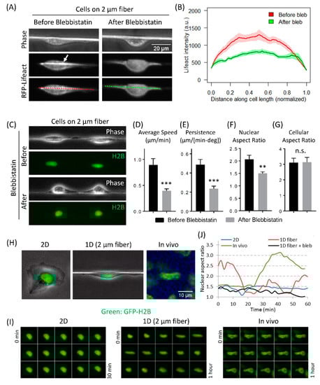 Actomyosin contractility regulates cell-intrinsic nuclear deformation and tumor cell motility in 1D. (A) Phase and RFP channel images of RFP-Lifeact (a marker for F-actin) expressing tumor cells migrating on fibronectin-coated 2 µm polymeric fiber before and after blebbistatin treatment. White arrow indicates a linear bundle of F-actin stress fibers. Red and green dotted lines in the bottom image panels indicate the lines along which the Lifeact intensity measurements were made and quantified in Figure 5B. (B) Quantification of RFP-Lifeact intensity along the cell length (marked with red and green dotted lines in Figure 5A) migrating on fibronectin-coated 2 µm polymeric fiber before and after blebbistatin treatment. Data plotted as line plot with solid lines showing the mean values and shaded areas representing SEM error bars around the mean, n = 13 cells. (C) Frames from time-lapse Movie S6, showing phase and GFP-H2B channels for MTLn3 cells moving on fibronectin-coated 2 µm polymeric fibers. Mid-way during the movie, cells were treated with 5 µM blebbistatin to inhibit actomyosin contractility. Note the nuclear morphology change from elongated to round after the blebbistatin treatment. (D–G) Quantifications of average cell speed (D), persistence (E), nuclear aspect ratio (F), and cellular aspect ratio (G) of tumor cells migrating on fibronectin-coated 2 µm polymeric fibers, before and after blebbistatin treatment. Data plotted as mean ± SEM, n = 13 cells. ** p-value < 0.01, *** p value < 0.001, n.s. not significant. (H) Still images from Movies S7–S9 of GFP-H2B MTLn3 cells moving in 2D, 1D (2 µm fibers), and in vivo, showing rounder nuclear morphology in 2D vs. elongated nuclear morphology in 1D and in vivo. (I) Time-lapse images of nucleus (GFP-H2B) shape dynamics, show static rounder nuclear morphology in cells moving in 2D, vs. dramatic nuclear shape changes observed in cell moving in 1D and in vivo. Time-lapse intervals are 2, 4, and 4 min for 2D, 1D (2 µm fibers), and in vivo, respectively. (J) Plots of nuclear aspect ratio change over time in cells moving on 2D substrate, in vivo, and in 1D. Note the actomyosin dependence of nuclear shape change in 1D.