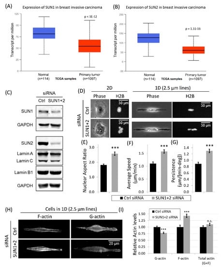 The LINC complex, Nesprin and SUN family proteins, reside in the outer and inner nuclear membranes, respectively [,,]. Together they provide a physical link between the cellular cytoskeleton and nuclear lamina and have been implicated in nuclear mechano-transduction and cell motility [,,]. Global loss of LINC complex components has previously been reported in breast cancer []. Analysis of The Cancer Genome Atlas (TCGA) dataset further confirmed that the expression of SUN1 and SUN2 is downregulated in breast cancer compared to normal breast tissue (Figure 6A,B). Moreover, downregulation of SUN1 and SUN2 was observed across tumor types (Figure S6A,B).