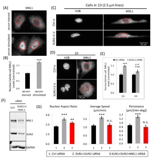 Forces required for increased motility of SUN1 + 2 knockdown cells are generated by increased F-actin polymerization (Figure 6H,I), suggesting upregulation of genes involved in F-actin polymerization. Changes in G- and F-actin levels in cells are known to cause nuclear translocation of MKL1 []. The activation of the SRF-MKL pathway upon nuclear translocation targets the transcription of many genes involved in the regulation of actin polymerization, dynamics and protrusion (e.g., cofilin, WASP, Arp2/3), cell–cell and cell–ECM adhesion (e.g., integrin, vinculin and cadherin), enhancing cell motility through a positive feedback regulation of actin polymerization [,,]. The role of MKL1 in cell motility is already known from many previous studies. MKL1 depletion leads to defects in cell motility in multiple cells including breast cancer cells [,,]. Our novel observation that LINC complex disruption leads to increased MKL1 nuclear translocation suggests crosstalk between LINC complex and SRF-MKL pathway and an important role of SRF-MKL driven gene transcription in 1D tumor cell motility. In fact, using triple knockdowns (SUN1, SUN2, and MKL1) in tumor cells, we show that MKL1 is required for enhanced 1D motility of SUN1 + 2 KD cells (Figure 7F,G). Future studies are required to identify specific SRF-MKL transcriptional genes involved in tumor cell motility in physiological environments.