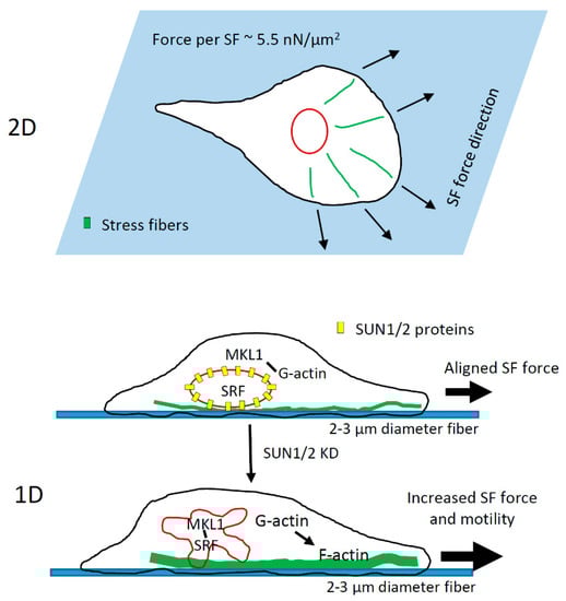In this work, we evaluated the roles of cell-extrinsic (collagen fiber diameter) and cell-intrinsic (SUN and MKL1 signaling) factors influencing tumor cell motility in 1D, the fibrillar ECM microenvironment which tumor cells encounter in vivo to invade locally and migrate to the nearest blood vessel for hematogenous dissemination to secondary sites [,,]. Our work demonstrates that tumor cells move the fastest on 2–3 µm diameter 1D fibers. 1D high-speed migration of tumor cells is closely linked to cell-intrinsic capacity for nuclear deformation. In addition, LINC complex disruption in tumor cells leads to even more enhancement in cell motility in 1D (Figure 8). Interestingly, these results were specific to 1D because tumor cells in 2D not only moved significantly slower, but also showed no changes in 2D motility after SUN and MKL1 signaling perturbations. Highly efficient high-speed tumor cell migration in 1D is achieved through bidirectional cell polarization in 1D and aligned cytoskeletal forces in the tumor cell along the ECM fiber axis, whereas in 2D, cytoskeletal forces are randomly distributed leading to lower net force in the direction of movement (Figure 8).