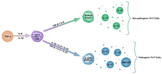 Development of pathogenic Th17 cells. Synergistic exposure to TGF-β and IL-6 induces transcription factors RORγt and Foxp3 to produce IL-17, IL-21 and an anti-inflammatory cytokine IL-10. Another way of inducing Th17 cells is synergistic exposure to IL-6 and IL-1β, which are produced under influence of TNFα. However, exposure to IL-23 induces receptor IL-23R to produce IL-17, IL-21, IL-22 and GM-CSF, therefore making Th17 cells pathogenic. Furthermore, it has been shown that IL-23 reduces the concentrations of IL-10, additionally contributing to Th17 pathogenicity.