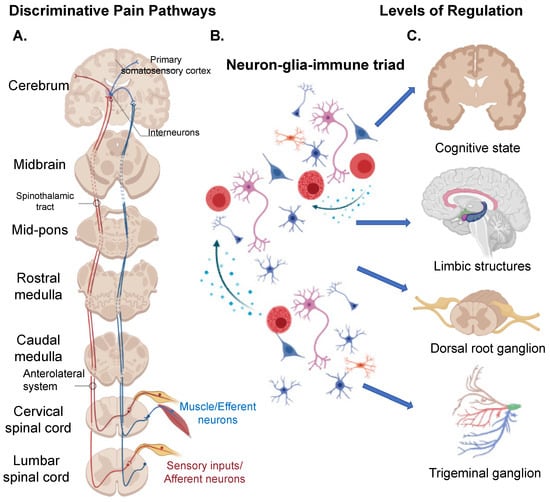 Pain pathways and levels of regulation. (A) The pain signal cascades through the central and peripheral nervous systems. Noxious sensory inputs from the lower and upper parts of the body are sensed by the afferent neurons that feed to the lumbar and the cervical spinal cord divisions, respectively. The information is relayed to the primary somatosensory cortex of the cerebrum; interneurons in the CNS transmit information to the efferent neurons that relay signals from the CNS to the effector organs, such as the muscles and glands. (B) The neurons in the CNS or the PNS are surrounded by glial cells. Resident or infiltrated immune cells release mediators that in turn modulate glial and neurons activity function at various levels. (C) Pain signal is regulated at several levels; an individual’s cognitive state regulates pain perception. The limbic system is key for integrating pain perception. Immune and glial cells respond to injury or noxious stimuli and modulate function of dorsal root ganglia, trigeminal ganglion, and limbic structures to alter pain perception. All these inputs are integrated and together constitute one’s cognitive state, which can affect pain perception and experience. Pain can be regulated at each level via the mediators summarized in Table 1.