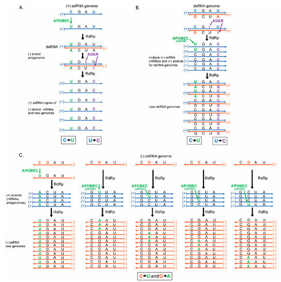 With these viruses being maintained differently requires different modes of replication (reviewed in [30]). Specifically, in positive-strand ssRNA viruses, RNA dependent RNA polymerase (RdRp) uses the positive genomic strand as a template to create a new negative strand copy (the anti-genome) that is subsequently used as a template to create large numbers of positive-strand viral RNA genomes (Figure 1). Alternatively, in negative-strand RNA viruses RdRp uses the genomic negative-strand as a template to create positive-strand antigenome, that also serve as mRNAs. RdRp subsequently uses the positive-strand anti-genome as a template to create large numbers of negative-strand viral RNA genomes (Figure 1). dsRNA viruses replicate their genome differently by generating positive-strand mRNAs (templated by the dsRNA genome) that are also used by RdRp as a template to create dsRNA genomes packaged into new virus particles (Figure 1). It should be noted that each virus type (even dsRNA viruses) relies upon multiple copies of ssRNA as intermediates of replication. This is important because, unlike dsRNA, the bases in ssRNA are not paired leaving the base exposed, therefore these ssRNA may be more prone to lesions such as base alkylation or chemical base deamination [31,32]. These lesions can stem from multiple sources (discussed at length in Section 5), but the major causes of lesions addressed in this review are the cytosine deaminases APOBECs and the adenine deaminases, ADARs.