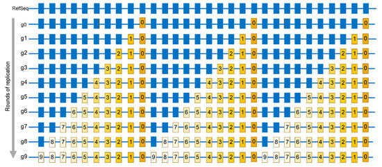 Simplified schematic of mutations accumulation in virus population. Mutations are identified by comparing a sequence of a viral isolate with a reference sequence (RefSeq). Individual positions where bases are mutated in at least one isolate are shown by rectangles. Blue rectangles are positions same as in RefSeq. g0—A genome of virus quasispecies starting a population that may already have some differences from RefSeq. g1—g9 rounds of replication generating additional mutations, which are numbered same as the generation in which a mutation event had occurred. Mutations occurring in later generations would be present in smaller fractions (reflected by the decreasing yellow color density) within the population. The entire set of independent mutation events would be described by the list in which every mutation is represented only once, regardless of the number of genomes where it is found. In this population, such a list is represented by the g9 genome.