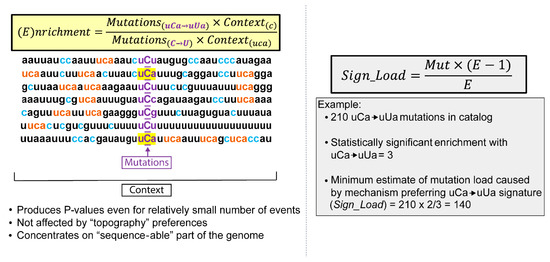 Trinucleotide motif-centered RNA mutational signature analysis. Shown is an example of an analysis for calculating the enrichment (E) and signature-associated mutation load (Sign Load) of uCa→uUa signature motifs in ssRNA, which are the two main outputs of trinucleotide motif-centered mutational signature analysis. Reverse complements are not included. Counted are all C→U mutations as well as all trinucleotide motif uCa→uUa mutations (5′ and 3′ flanking nucleotides shown in small letters; mutated C shown in capital letters). Also counted are all cytosines (c), represented in blue, and all motif-conforming trinucleotides (uca), represented in orange, in 41 nucleotide contexts centered around mutated cytosines. (E) values show the fold-difference between actual fraction of uCa→uUa mutations among C→U mutations in all trinucleotide motifs and the fraction of motif conforming trinucleotides (uca) among all cytosines (c) in the immediate vicinity of mutated cytosines. Counts used for enrichment calculation can be also used for calculating p-values in order to identify trinucleotide mutational motifs with statistically significant enrichment. Statistically significant enrichment values can be used for minimum estimates of a (Sign Load).