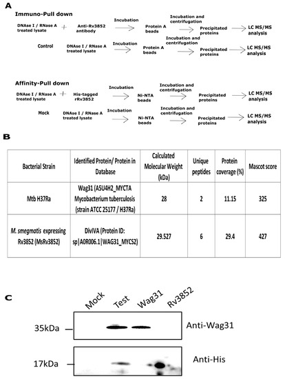 Mtb H37Ra and MsRv3852 strains were grown until mid-exponential phase, and co-immunoprecipitation was carried out as described previously [32,33]. Elutions of the antibody protein A sepharose beads and the only protein A control beads were resolved on SDS-PAG until 1cm migration, and the sample containing pool of proteins was excised. Subsequently, the samples were carbamidomethylated and trypsinized. The tryptic digests were injected on a Dionexnano-LC system followed by MS/MS analysis on a Bruker Maxis Impact QTOF instrument. The spectra obtained were analyzed using Mascot search. The unique protein hits present in the experimental and absent in control samples were considered putative interactors. For confirmation of interaction in Mtb H37Rv, the lysate of exponential phase culture was prepared by bead beating (Fast Prep Instrument, MP Biomedicals; 6.0 m/s speed; 30 s on/30 s off) in a buffer containing 10 mM Tris (pH 7.4), 100 mM NaCl, and 10 mM PMSF. The lysate was treated with 10 U each of DNase I and RNase A. A total of 2.5 mg lysate was incubated with 6× His-tagged Rv3852 protein for 2 h at 4 °C and then incubated with Ni-NTA beads for 2 h and centrifuged. The interacting proteins were eluted, electrophoresed on a 12% SDS-polyacrylamide gel and transferred onto PVDF membrane. The membrane was cut at 25 kDa, and the lower blot was incubated with 1:10,000 dilution of anti-His antibody (Abcam, UK) in 1X Tris-buffered saline (TBS) with 2% BSA (MP Biomedicals, Santa Ana, CA, USA) for 2 h, followed by three 10 min washes with TBST (TBS with 0.1% Tween 20). Later, it was incubated with 1:10,000 dilution of HRP-conjugated anti-mice secondary antibody (Abcam, UK) in TBS with 2% BSA for 2 h. Similarly, the upper blot was incubated with 1:5000 diluted Wag31 antibody, washed, and then incubated with 1:10,000 dilution of HRP-conjugated anti-rabbit antibody. The blots were developed with chemiluminescent HRP substrate (Merck Millipore, Burlington, MA, USA) using Image quant LAS 4000 system (GE Healthcare, Chicago, IL, USA).