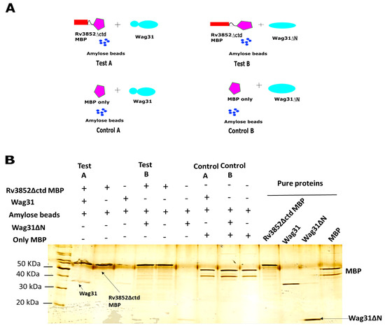 Since N-terminal region containing the lipid binding domain of Wag31 is responsible for its localization in the cell membrane [35], a Wag31 deletant (Wag31∆N), lacking the N-terminal region was used to see whether the interaction between the two proteins was retained. The purification profile of Wag31∆N is shown in Figure S1. As the anti-Wag31 antibodies used for previous interactions showed very weak binding to Wag31∆N, we resorted to amylose beads-mediated affinity precipitation strategy. Fusion proteins comprising Rv3852 or Rv3852∆ctd and maltose-binding protein (Rv3852-MBP and Rv3852∆ctd-MBP) were generated for the purpose and used (Figure 3 and Figure S2). The reactions were set according to the schematic shown in Figure 3A. In the test sample A, Wag31 protein interacted with Rv3852∆ctd-MBP, while in test sample B, Wag31∆N did not interact with Rv3852∆ctd-MBP, suggesting that N-terminal region of Wag31 might contribute to the interaction of Wag31 with Rv3852 (Figure 3B). Similarly, Wag31∆N did not interact with Rv3852 (Figure S2). No interaction was seen with Wag31 and Wag31∆N in control reactions having only MBP protein (Figure 3B).
