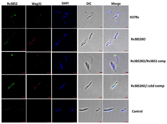 3.4. Rv3852 Influences Localization of Wag31 in the Mycobacterial Cell Wall